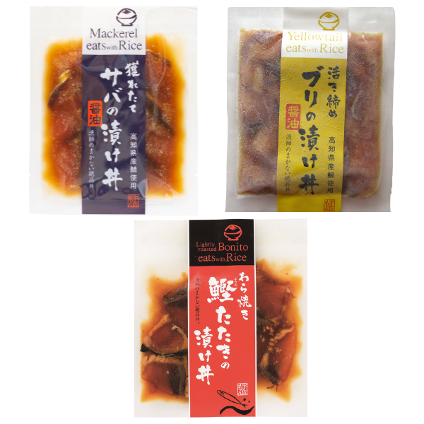 - (獲れたてサバの醤油漬け丼・活き締めブリ の醤油漬け丼)各60g×各2袋(わら焼き鰹たたきの 漬け丼)65g×2袋 計6袋