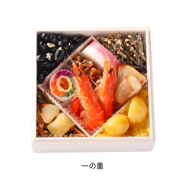 金箔黒豆/アーモンド入り田作り/栗きんとん/数の子入り松前漬/紅白かまぼこ/カラスガレイ西京焼/浜汐えび/彩りきぬた巻/くるみのかつお和え
