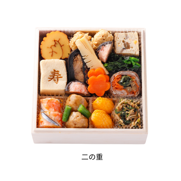 伊達巻/ぶりの子煮/山形県産きのこの松風/寿高野豆腐/海老椎茸/身欠きにしん昆布巻/竹の子土佐煮/わかめ出汁漬/梅花人参/菜の花福良漬/山形牛旬菜巻/えびときびなごの手綱巻/蓮根入りつくねの照り煮/いんげん/松笠いか雲丹焼/ちりめん青菜炒め煮