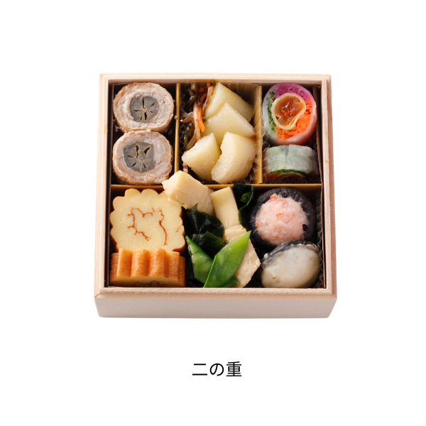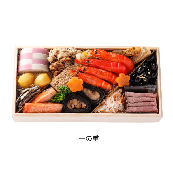 市松かまぼこ/栗きんとん/田作り/たたきごぼう/かつおくるみ/はな切り大根のはりはり漬/カラスガレイ西京焼/鶏松風/浜汐海老/菜の花/梅花人参/鰊昆布巻/銀鮭西京焼/金箔黒豆/紅白なます/ローストビーフ(ソース付)