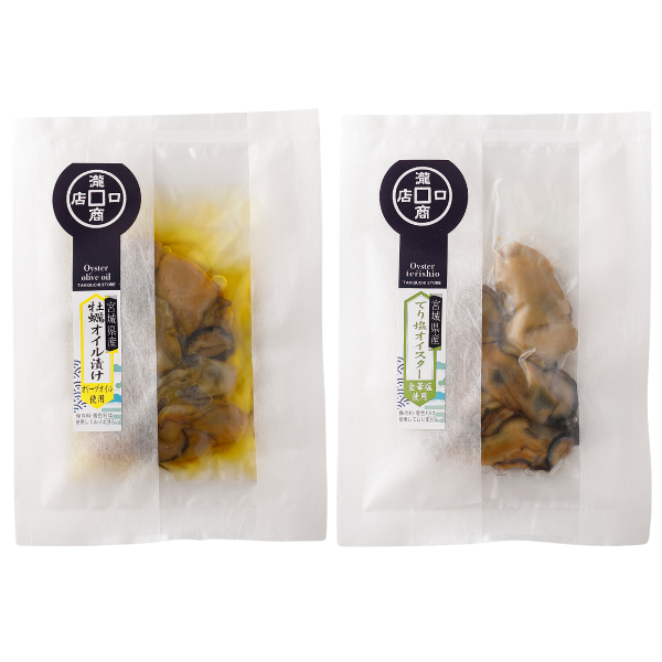 宮城県産の牡蠣を調味料にもこだわって丁寧に調理しました。てり塩オイスターで使っている塩は牡鹿半島の海水で造られた「金華塩」。オイル漬けはエキストラバージンオリーブオイルで漬け込んでいます。そのまま食べても濃厚な旨味が口に広がり、大人の贅沢心を満たす味わい。パスタにするとさらにおいしさがひきたちます。