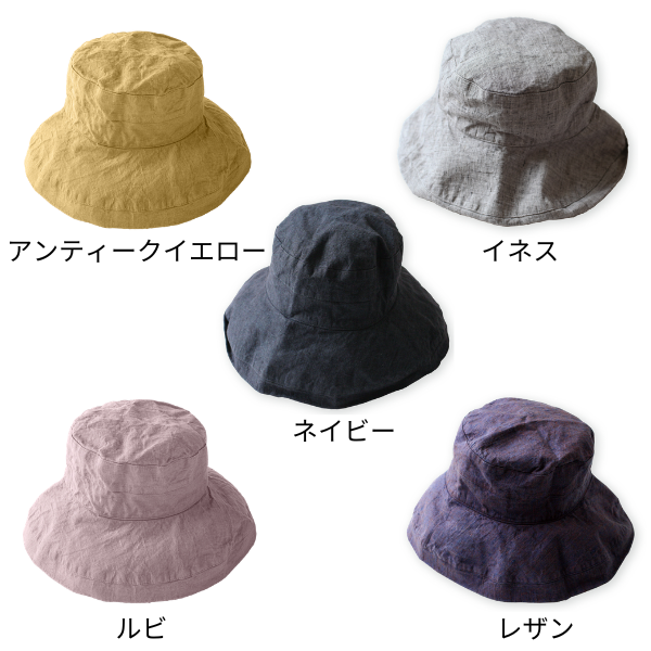 大人気のリネン素材の帽子に、新色のネイビー・アンティークイエロー・ルビが仲間入り。つばが12cmと広く、顔まわりから首の後ろまで、日差しをしっかりカバー。通気性よく蒸れにくいので、行楽のおともに、毎日の散歩やガーデニングに、これからの季節も大活躍します。エレガントな雰囲気ですが、カジュアルな服にも似合い、上品にスタイルアップ。つばを折り曲げれば変化をつけて楽しめます。折りたためるので、持ち運びにも便利。