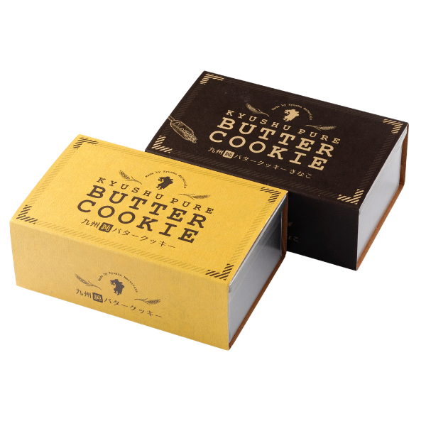 明治34年創業の老舗が作る、原材料にこだわったクッキー。ザクッ、ほろっととけるやさしい口どけ。「九州純バタークッキー」と、宮崎県都城の在来大豆「みやだいず」で作ったきな粉と和三盆糖を丁寧にまぶした「九州純バタークッキーきなこ」をセットで。