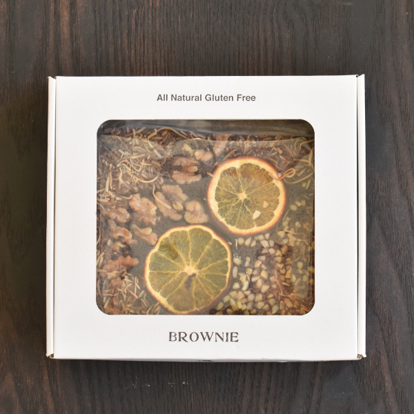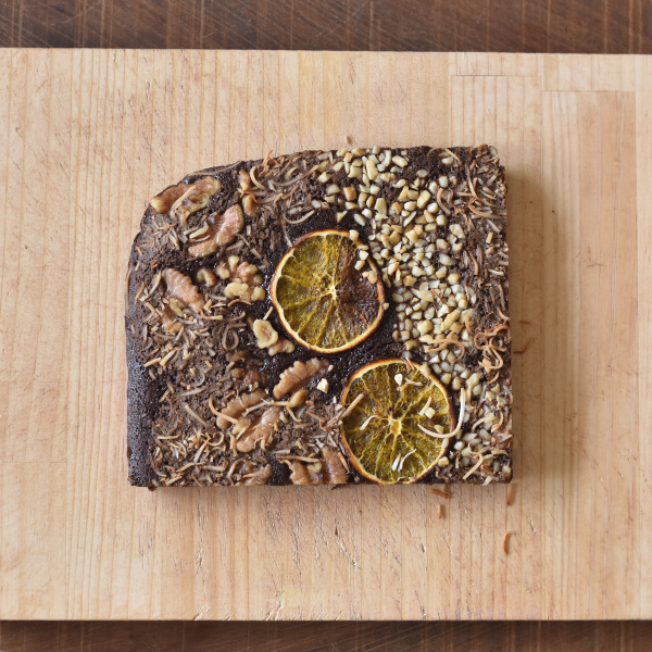 米粉をベースに香ばしく焙煎した黒豆きなことオーツ麦粉を混ぜこんだしっとり濃厚なブラウニー。ドライフルーツの甘酸っぱい風味と、トッピングのナッツ類の食感もアクセントになって美味。