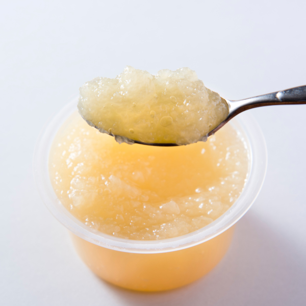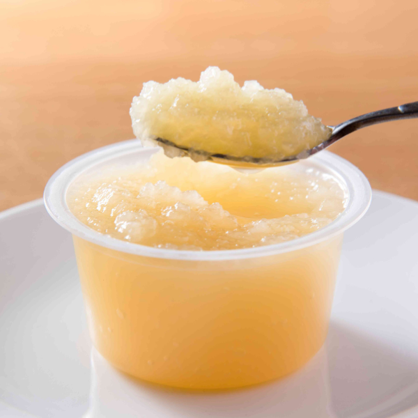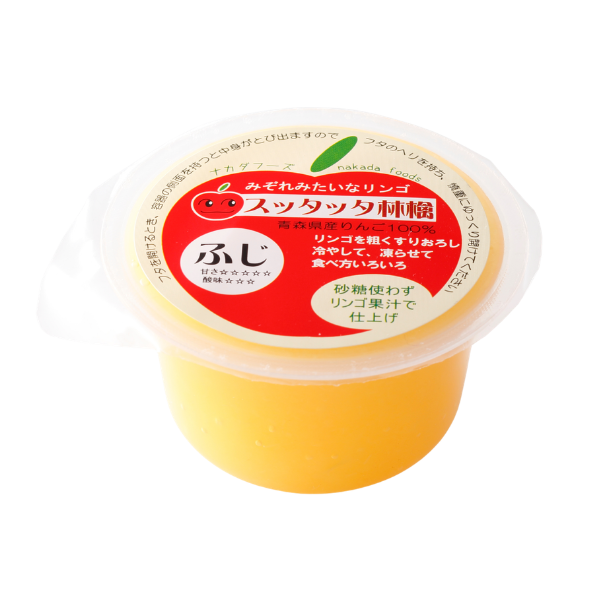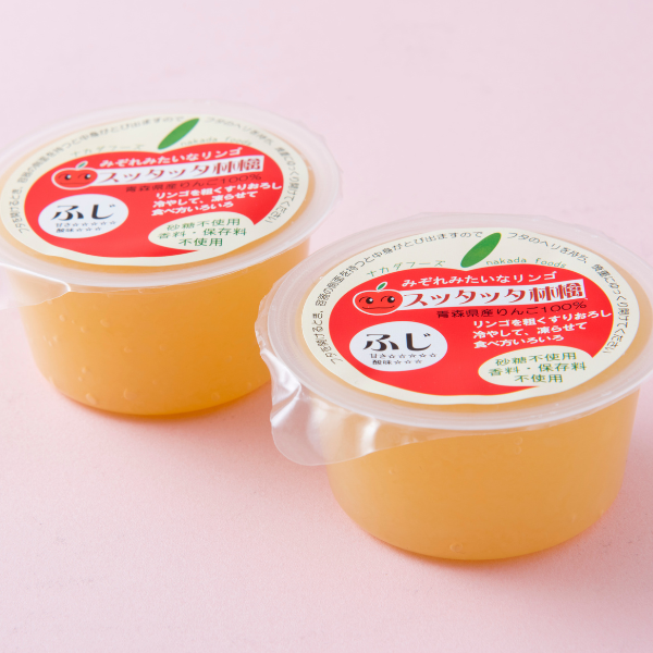 青森県産りんご「ふじ」のすりおろしにりんごの濃縮果汁を加えてあります。酸化による変色を防ぐためにビタミンCを加えていますが、その他の添加物や砂糖は使っていません。大きめの粒で丁寧にすりおろしているため、りんごの食感もしっかり感じられます。