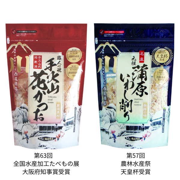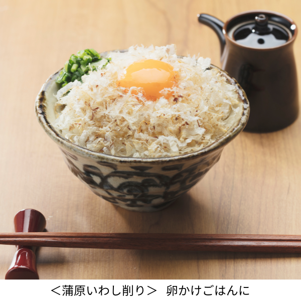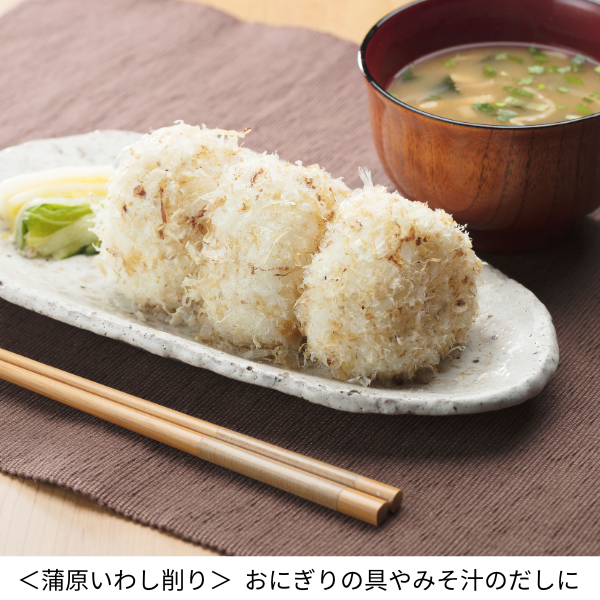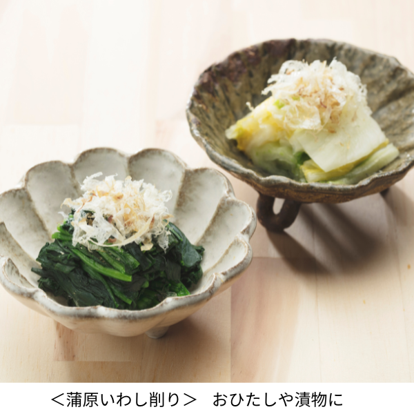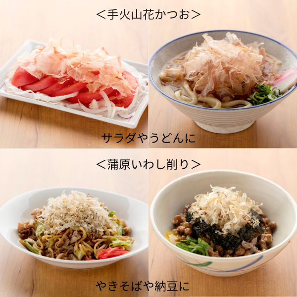 手火山式とは鰹節を作る際に燻製させる江戸時代から続く製法のこと。手間がかかり高度な技術が必要とされるため、今ではほんの数社しか作っていません。口に入れると溶けてしまうくらい薄く削ってあり上品なお味です。蒲原いわし削りは九州産のいわしの煮干しを削ったもの。濃厚な味とすっきりしたうま味で、数々の賞を受賞している逸品です。