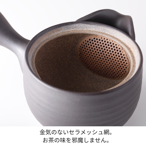金気のないセラメッシュ網を使い、注ぎ漏れがなくスムーズに注げる広口型で作った常滑焼の急須。一体成形のセラメッシュ網は、金気がないのでお茶の味を邪魔しません。また広い胴体部分で茶葉がしっかり広がり、お茶本来のうま味を引き出します。
