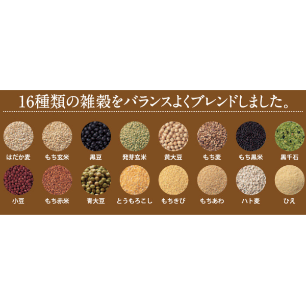 - はだか麦(国内製造)、発芽玄米(国内製造)、黒大豆(黒千石87%、黒豆13%)、もち玄米、もち麦、もち黒米、もちきび、とうもろこし、ハト麦、もち赤米、青大豆、もちあわ、黄大豆、小豆、ひえ、食塩、魚しょう、焼酎(米焼酎、麦焼酎、酒かす焼酎)、穀物発酵液(玄米、食塩、はだか麦、もちあわ、もちきび、ひえ、ハト麦、赤米、黒米)